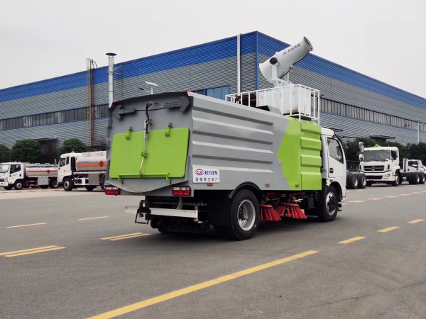 后噴霧:在洗掃車后部垃圾箱下方配有噴霧噴桿,噴霧噴桿上裝有多個噴霧噴嘴。啟動副發動機和高壓水泵,打開后噴霧開關,啟動底盤車前行,就可進行噴霧降塵作業。