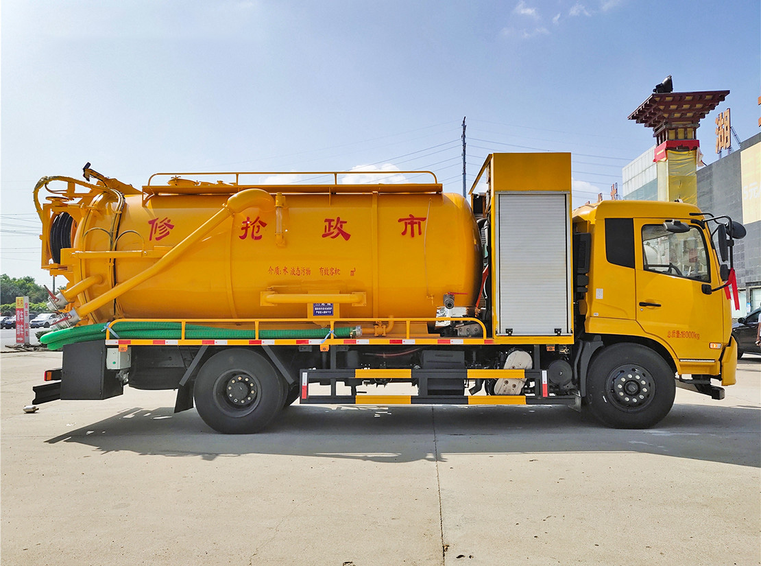 吸污部分:10方污罐,罐體8mmQ235優質碳鋼,配濰柴375副發動機帶淄博SK-30水循環泵,還可以選配羅茨泵。10米吸污管一根,進氣管加過濾網,防溢閥加高,后蓋卡扣鎖緊,前視污亮管,后尾部加裝3個力拓牌100mm的球閥吸污口,150mm口徑排污閥,600mm排污口液壓開啟,罐體帶舉升功能,尾部后蓋可液壓開啟。