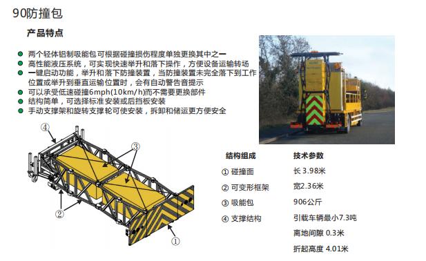 上裝配置:護(hù)箱:采用Q235國標(biāo)邊3mm底板花紋板3mm厚,箱體后部防撞包采用美國進(jìn)口SS90型號,防撞緩沖吸能模塊主要由車載防撞緩沖墊和導(dǎo)向標(biāo)志架組成,充當(dāng)施工作業(yè)車輛后方的緩沖衛(wèi)士。如若發(fā)生追尾事故,能夠在肇事車輛和前方施工作業(yè)區(qū)域之間構(gòu)建一個緩沖區(qū)域,通過機(jī)具結(jié)構(gòu)變形吸收撞擊的能量,**限度地降低被保護(hù)人員及設(shè)備遭到碰撞的幾率。高性能液壓系統(tǒng),可實現(xiàn)快速舉升和落下操作,方便設(shè)備運(yùn)輸轉(zhuǎn)場,一鍵啟動功能,舉升和落下防撞裝置,當(dāng)防撞裝置未完全落下到工作位置或舉升到垂直運(yùn)輸位置時,會有自動**告音提示。防撞包采用進(jìn)口美國EA防撞包。
